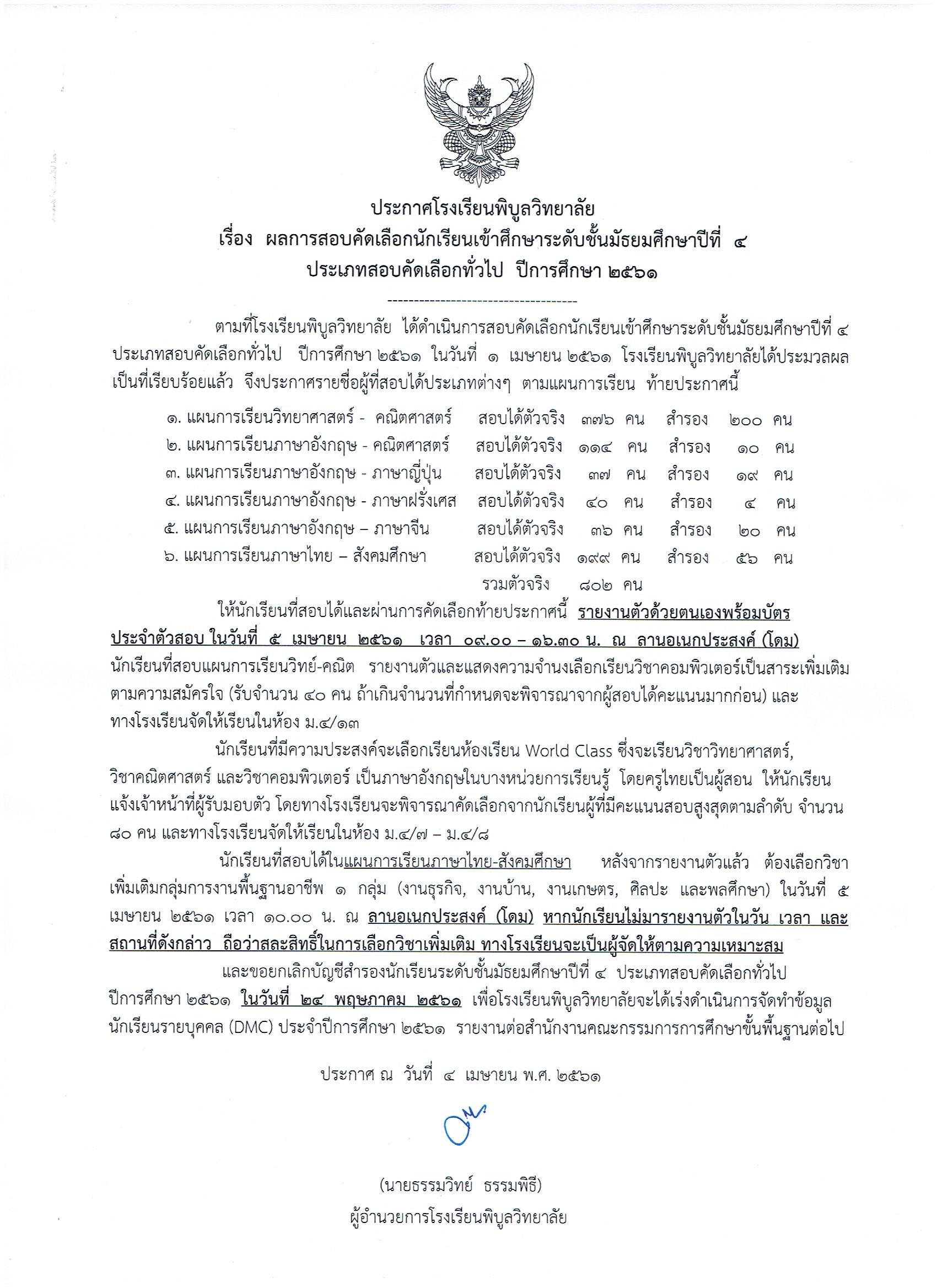 ม.4 ปีการศึกษา 2561 ประเภทสอบคัดเลือกทั่วไป |